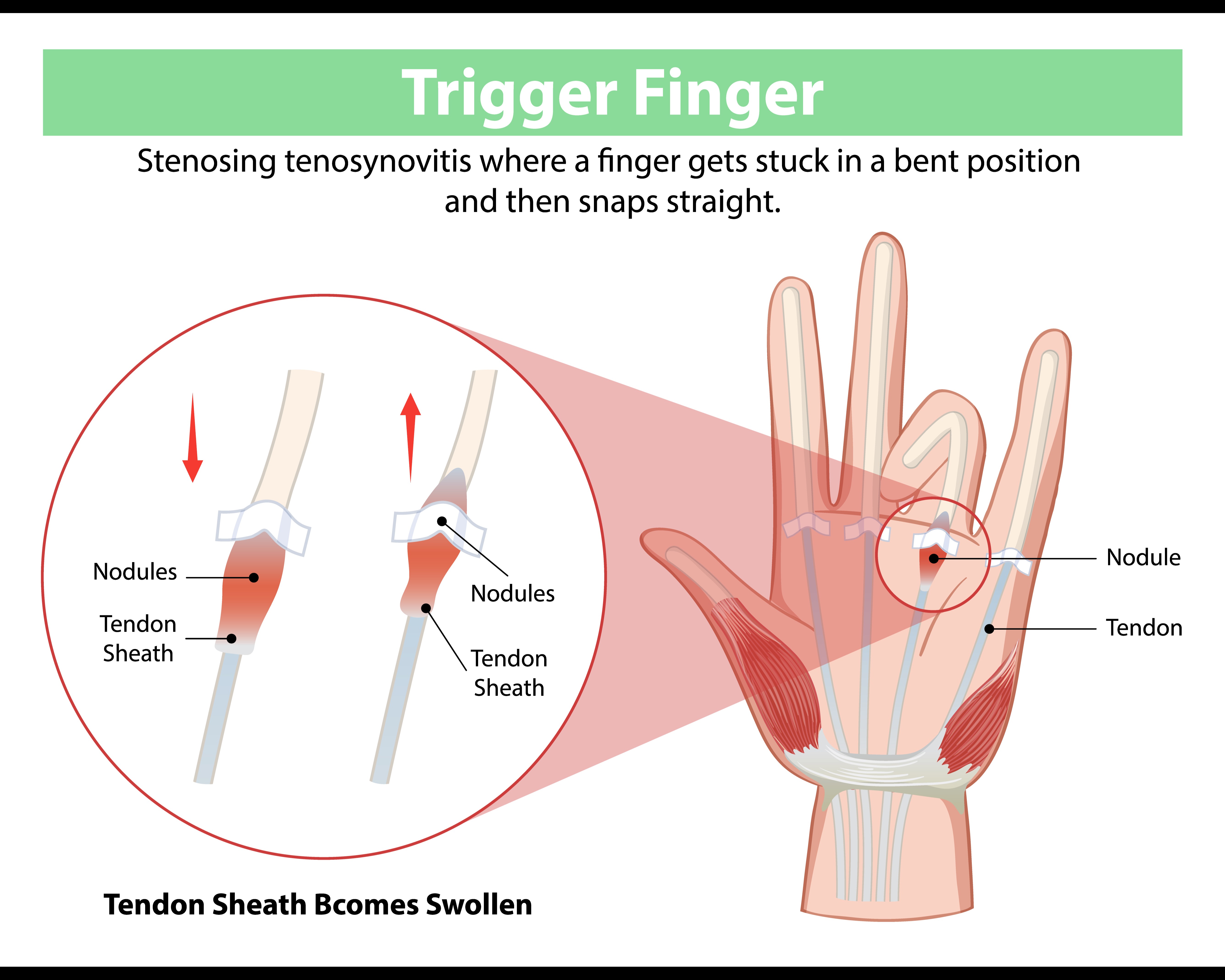 - Stiffness or locking of the finger in a bent position